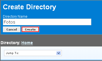 Quando criamos a conta, só existe um Diretório: "Home". Se quiser organizar seus arquivos, crie novas pastas. Clique no botão destacado acima "Create Directory".
